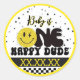 Personalized One Happy Dude first birthday sticker featuring faux glitter yellow ONE typography, smiley face “O” with lightning bolt wink, and custom baby name and birth date makes the perfect finishing touch for a fun, modern first birthday celebration.