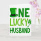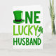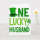 This card features the stacked phrase “ONE LUCKY HUSBAND” centered on a bright white background, with “ONE” and “HUSBAND” in deep emerald green and “LUCKY” in a lighter lime green 💚. The words sit in strong, sans-serif letters, arranged vertically so your eye moves smoothly from top to bottom. A leprechaun top hat takes the place of the “O” in “ONE,” with a dark band and a small gleam along the brim that makes it look slightly glossy. The overall look feels like a cheerful nod between partners, as if the message is being said with a grin and an arm around the shoulder ☘️. A four-leaf clover replaces the “Y” in “LUCKY,” adding a textured, cross-hatched look that stands out against the smoother lettering. The text stays centered with generous white space around it, keeping the green palette front and center. The hat sits at the top of the stack and the clover appears near the middle, both tucked neatly into the letter shapes.