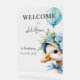 the story of a joyful milestone— very first birthday, a celebration wrapped in love, warmth, and a touch of whimsy. The design centers around a charming goose, lovingly illustrated as if plucked from the pages of a beloved children’s book. He’s not just any goose—He’s “one silly goose,” dressed for a party in a striped hat and floral crown, proudly clutching a Blue balloon. His expression is wide-eyed, innocent, and full of personality—just like a one-year-old discovering the world.