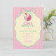 A charming pastel birthday design featuring a sleepy pink cat in a tiny party hat, framed inside a soft cream label with mint green bow details. The pink-and-yellow striped background adds a cheerful retro touch.
