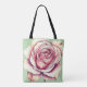 A tote bag with a aging rose, the artwork of the rose is created digitally with a computer and software that gives the rose a vintage look. There is a soft pastel green, that helps make the rose stand out.