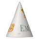 Top off your little one's big day with this adorable personalized party hat featuring a sweet watercolor bear wearing his own tiny striped party hat. Customize with your child's name to create a precious matching accessory that completes your Onederful Bear & Friends First Birthday Collection perfectly. The charming oversized name lettering in soft sage green creates a festive yet elegant look that photographs beautifully for those precious first birthday memories. These delightful party hats make wonderful keepsakes for the birthday child and fun accessories for all little guests to wear throughout the celebration.