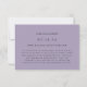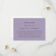 Mit dieser einfachen und klassischen, textbasierten Hochzeitszutrittskarte auf blasslila lila machen Sie eine Erklärung von dezenter Eleganz. Verwenden Sie die Anpassungsoption, um alle Farben zu ändern, um Ihr Hochzeitstil Anzug. Personalisieren Sie den gesamten Text dieser Online-UAWG Insert-Karte und leiten Sie Ihren Gast zu Ihrer Hochzeitswebsite für zusätzliche Informationen, während Sie einige Bäume und Geld bei der Rückkehr Porto gerettet.