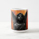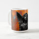 Eine glänzend schwarz-obsidian-glänzende Engelstatue mit zarten Flügeln und lebhaften blauen Augen sieht nach oben vor einem leuchtend orangefarbenen, gesprenkelten Hintergrund im kühnen Kontrast, der eine dramatische gotisch-barocke Stimmung für Fantasy-Fans, spirituelle Dekorliebhaber und auffallende Tasse- oder Textildesigns schafft.