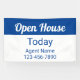 This real estate open house banner has display text says "Open House Today" but you can change the wording as needed. At the bottom, there's a place to add the real estate agent's name and phone number. The top portion is blue. The rest of the banner is white. All text can be edited or deleted.