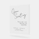 Das elegante, offene Hochzeitszeichen beinhaltet die Namen, das Datum und die Lage der Paare. Es ist ein minimalistisches und simplistisches Schwarz-Weiß-Design, das für jede Hochzeit passt.