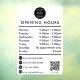 A white opening business hours window decal and window cling featuring business logo, QR Code, your custom social media icons and contact details. A personalized shop hours window cling perfect for shop windows and front door signs. Perfect for a business shop owner who would like to notify their customers about its opening hours.