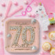 Ein Meisterwerk für einen Meilenstein. Diese "70." Geburtstagsplatte ist mit einem Mosaik aus eleganten Perlen aus Gold und Weiß, Set vor einem weichen, rot rosa Hintergrund mit schwimmenden Ballons und Konfetti ausgestattet. Das perfekte Herzstück für ein anspruchsvolles 70. Geburtstagsfest.