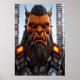 Eine orangefarbene Alien mit schwarzem Haar und Bart in der Stadt. Das ist eine künstlerische KI.