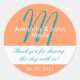 Aqua White Simple Initial Gastgeschenk Hochzeit Danke Sticker. Personalisieren Sie Ihre Gastgeschenke Hochzeiten mit diesem eleganten, einfachen, stilvollen Hochzeitsaufkleber mit türkisfarbenem, orangefarbenem und Hintergrund, Braut- und Bräutigam-Namen und Monogramm-Initial, sowie Ihrer Danksagung und Ihrem Hochzeitstermin, die in eleganten Schriftart gedruckt sind. Design von Elke Clarke©. So können Sie Ihre Gastgeschenke Hochzeiten ganz individuell gestalten.