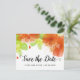 Handgeschriebene Skriptkalligraphie und orange ätherische Blume blumengeschmückte Hochzeit im Herbst Save the Date Postkarte. Der obere Teil ist mit hübschen orangefarbenen Blume und grünen Blätter bedeckt.