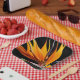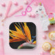 Hier können Sie Geburtstagskuchen und Desserts genießen, die mit den farbenfrohen Tellern aus dem Foto der Orangenblüte der Pflanze "Bird of Paradise", auch bekannt als Krane-Blume, auf schwarzem Hintergrund gedruckt sind. Ein schönes, blumengeschmücktes Design! Wählen Sie Ihren Papierplattenstil aus.