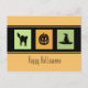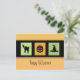 Glückliche Halloween-Postkarten mit lustigen Illustrationen eines Hexenhutes, einer schwarzen Katze und eines Kürbchens, in Orange, Schwarz und Grün.