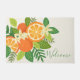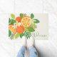 Ein helles, elegantes orangefarbenes Blumendesign. Das Design kann mit Ihrer eigenen Nachricht und Ihrem eigenen Namen personalisiert werden. Diese von Hand gezeichnet Abbildung enthält handgezeichnet Bilder von Orangen, Scheiben, Blüten von Blume und Blätter in kräftigen Farbtönen wie Orange, Gelb, Grün und Creme.