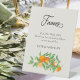 Orangefarbene Blossom Gastgeschenk Hochzeit Tafelschild mit Orangen, Orangenblüten und Grünpflanzen auf neutralem Hintergrund. Frisch, zesty, natürliches Design, um eine Frühlings- oder Sommerhochzeit mit einem Orangenfruchthochzeitthema zu ergänzen. Für die Koordinierung von Einladungen, Schreibwaren, Tag der Veranstaltung und Tischdekoration, Spielen und Hochzeitsschildern, schauen Sie bitte in meiner Orange Blossom Wedding Collection nach oder schreiben Sie mir, um zusätzliche Artikel hinzuzufügen, die Sie brauchen.