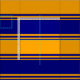 Das Design ist in Orange und Blau mit Streifen gestaltet.