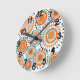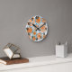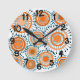 Diese Wanduhr hat ein Muster von Ringen und Kreisen in Orangetönen, und hinter ihnen kreuzen aquamarine Linien, die Blume auf einem weißen Feld bilden.