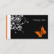 Visitenkarte in einem auffallenden Schwarz-, Weiß- und Orangendesign mit einem orangefarbenen Schmetterling auf schwarzem Hintergrund mit hübschen Wirbel aus weißem Blumen. Die Karte hat eine orange-weiße Linie auf der Seite. Der Text und die Schriftart auf der Vorder- und Rückseite der Karte können leicht geändert werden. Besuchen Sie den Laden für eine Reihe von koordinierten Werbeprodukten für Unternehmen.
