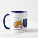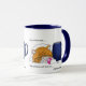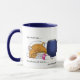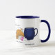 Eine orange-weiße Katze will sich wecken, da sie noch immer so müde sind, wie sie neben einer großen Tasse Kaffee liegen