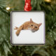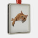 Portrait einer orangefarbenen, auf einem weißen Hintergrund aufgesetzten, auf einem Tisch aufgesetzten Katzenjacke