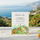 Botanisches Thema Hochzeit Details Karte zeigt ein orangenfarbenes Aquarellbild mit Zitrusfrüchten Blätter und Blüten. Die Rückseite ist ein Vintages beige italienisches Design. Kunstwerk von KL Stock.