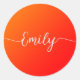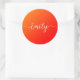 Lebhafter orangefarbener Farbverlauf für runde Aufkleber. Erleben Sie die Eleganz unserer Schriftart mit exquisiten Wimpern. Schönes künstlerisches Design von Alma Wad. Personalisieren Sie es mühelos mit Ihrem eigenen Text oder Namen. Verbessern Sie Ihren Namen mit stilvollen Swashes. Platzieren Sie es einfach zwischen den Symbolen im Personalisierungsbereich.
