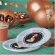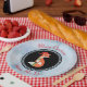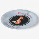 Papier-Teller mit einer niedlichen Orangenfox-Abbildung in einem schwarzen Kreis. Er trägt eine rote Weihnachtsmannmütze und hat festlich grüne dekorative Akzente auf seinem Schwanz und auf der anderen Seite seiner Brust. Frohe Weihnachten und Glück neues Jahr geschrieben am Rande des Tellers. Der Hintergrund ist Vintag und blau grau mit einem verblassten Punktmuster am oberen und unteren Ende.