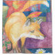 schöner orange Fuchs in einem bunten verzauberten Wald, der mit Blumen gefüllt wird, kriecht sorgfältig und neugierig aus seiner Höhle in dieser Malerei heraus.