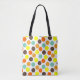 Diese Tasche hat ein geometrisches Design aus blau, orange, gelb und braun Punkten.