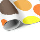 Dieses Verpackungspapier hat ein geometrisches Design aus blauen, orangen, gelben und braunen Punkten.