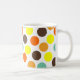 Diese Tasse ist geometrisch mit blauen, orangen, gelben und braunen Punkten gestaltet.