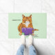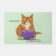 Eine niedliche Orangenkatze, die vor einer lila Tasse Kaffee sitzt, im Hintergrund von Grün
