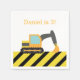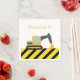 Bauen Sie ein bauthematisches Kindergeburtstag Party mit diesen passenden Party-Vorräten! Das Design hat einen niedlichen orangefarbenen und grauen Bagger, ein gelb-schwarz gestreiftes Streifen Muster für den Hintergrund. Personalisieren Sie die Party-Nachricht.