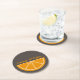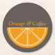 Ein brauner Untersetzer mit einem orangefarbenen Halbschnitt und anpassbarem Text. Es kann verwendet werden, wenn Sie Freunde oder Familienmitglieder auf Zuhause oder in einer Bar empfangen haben!