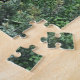 Dieses helle und farbenfrohe, detaillierte Puzzle mit einem orangefarbenen Kolibri, das von einer Blume aus dem blauen Hibiskus schlängelt wird, Set gegen tropische Pflanze.