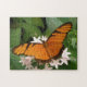 Dieses phantastische Rätsel zeigt ein Foto eines wunderschönen tropischen Schmetterlings, der auf einigen exotischen weißen Blume sitzt. Diese Art wird als Julia Butterfly (Dryas iulia) bezeichnet. Es ist ein lebhafter Orangenschatten mit einigen schwarzen Markierungen auf den Flügeln. Es kommt aus den USA und Südamerika. Das Foto wurde mit Makrofotografie für ein erstaunlich detailliertes Ergebnis aufgenommen.