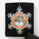 This cool customized high school lacrosse player photo gift features white typography of your team and player name on an orange snowflake Christmas ornament with a ball and rackets icon. Personalize with your athlete's photograph and class year as a proud sports parent.