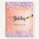 Ein goldener Hintergrund in Orange und Rose. Dekoriert mit Rose Gold und violett, lila Imitate Glitzer Glitzern. Personalisieren und fügen Sie einen Namen, Der Titel: Sketchbook geschrieben mit einem mädchenhaften, handgeschriebenen Stil Skript mit Swashes und ein Pinsel. Schwarze Buchstaben. Ein Notizbuch für Zeichnungen, Skizzen, Noten und Hausaufgaben in der Schule.