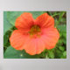 Dieses schöne Bild zeigt ein detailliertes Foto einer hübschen orangen nasturtium Blume, umgeben von Blättern. Das Foto wurde mit Makrofotografie aufgenommen und zeigt die lebendige Farbe und die komplizierten Details dieser beliebten Blume.
