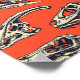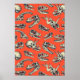 Auf diesem Poster stehen handillustrierte Dinosaurier-Schädel in Marineblau und Creme auf einem hellrot-orangen Hintergrund.