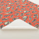 Diese Sherpa-Decke mit handillustrierten Dinosaurierschädeln in Marineblau und Creme auf einem hellrot-orangen Hintergrund.