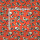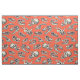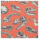Dieser Stoff hat illustrierte Dinosaurier-Schädel in Marineblau und Creme auf einem hellrot-orangen Hintergrund.