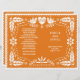 Orangefarbenes Papel Picado liebt Vögel Hochzeitsfiesta gefaltet Programm. Es zeigt zwei weiße Livebirds und eine Liebe Herz mit dem Wort Liebe und Blume, Blätter und kleine Punkte auf rot auf orange Farbe. Dieses mexikanische Folk Art Blumendesign Hochzeitsvorlage ist vollständig anpassbar. Verwenden Sie nur diesen Papiertyp, da er sich gut faltet.