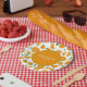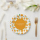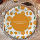 Teller mit einem Schnitt, halber und vollorangefarbenem Muster. Ein benutzerdefinierbarer Text ist in der Mitte auf orangefarbenem Hintergrund verfügbar. Eine frische Dekoration für eine Geburtstagsfeier, eine Hochzeit, ein Party, eine Pension, einen Junggeselinnen-Abschied, etc.