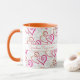 Dieses lustige Design zeichnet sich durch zwei miteinander verbundene Herzmuster aus. Das obere, größere Muster hat ein rosa und orangefarbenes Herz und hinter den beiden Seiten des Griffes sind schwarz umrissene Herzen mit Vorlagentext verbunden. Personalisieren Sie den Text oder klicken Sie auf Anpassen, um einen Schriftart auszuwählen, den Sie bevorzugen. Wählen Sie aus einer Vielzahl von Tasse-Stilen, um Ihren Geschmack.
