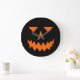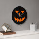 Orange auf schwarzen Kürbislantern Gesicht mit Dreieck Augen und Nase und einem bösen Grinsen.