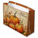 Geschenktasche mit einer rustikalen Abbildung mit orangefarbenen Kürbissen und Herbstlauben. Eine Herbstgrunge-Atmosphäre.