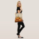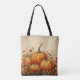 Tasche mit einer rustikalen Abbildung mit orangefarbenen Kürbissen und Herbstlauben. Eine Herbstgrunge-Atmosphäre.