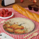 Teller aus Papier mit einer rustikalen Abbildung mit orangefarbenen Kürbissen und Herbstlauben. Eine Herbstgrunge-Atmosphäre.