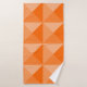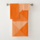 Dieses Handtuch-Set hat ein Badehandtuch mit einem geometrischen Design von Dreiecken, die Quadrate bilden, die wie eine Vogelperspektive von Pyramiden aussehen. ein helles orangefarbenes Waschlappen und ein dunkleres orangefarbenes Handtuch.
